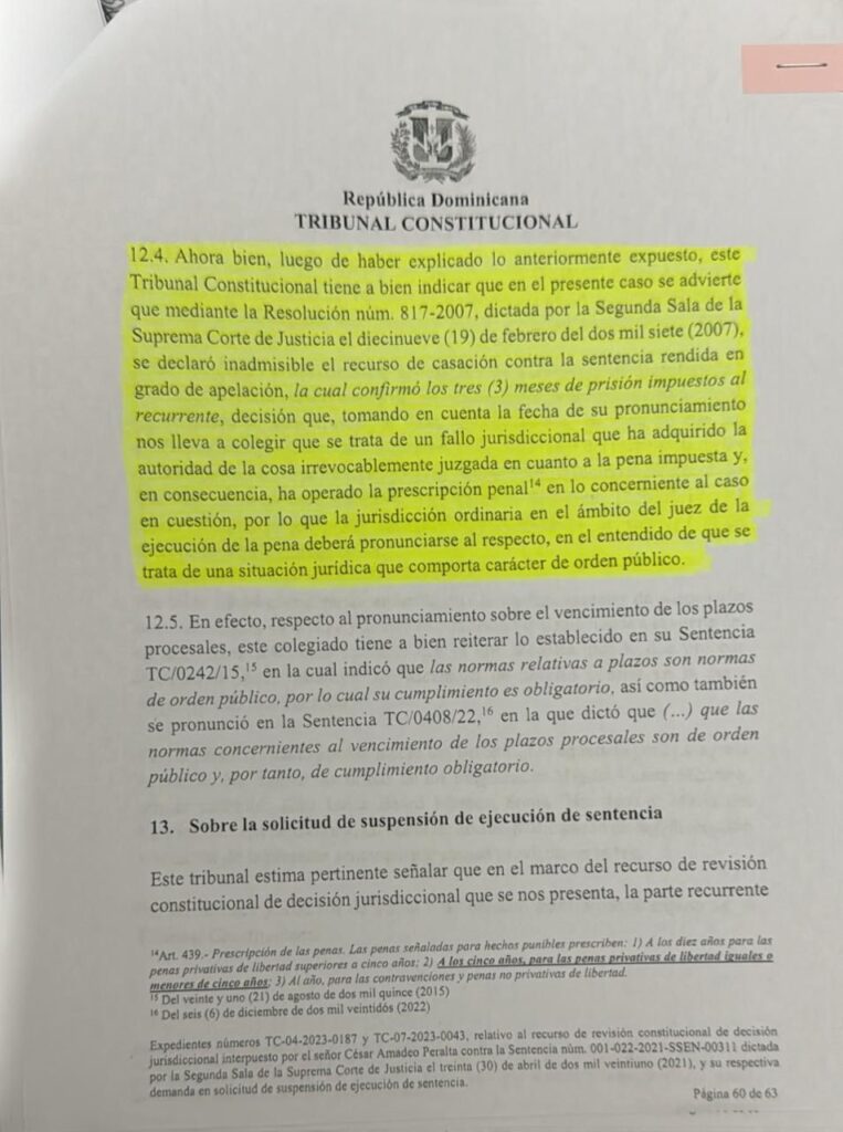 Que el año 2006 hace 19 años una banda de falsificadores de títulos le inventaron un falso proceso por violacion de propiedad privada la cual prescribió a los 5 años ósea en el año 2011 y el tribunal Constitucional mediante sentencia No. TC/0258/2024 d/f 9-8-24 página 60, ítems 12.4 y 12.5 declaro que ese caso contra el abogado Amadeo Peralta se encontraba ya prescrito desde el día 12 de septiembre del 2013 ósea hace 12 años y estamos en el año 2025 y esos delincuentes pretenden revivir una desicion dada hace 19 años , por lo que calificó esta campaña sucia en su contra como una trama para atentar contra su vida, señalando directamente a un grupo que calificó como “falsificadores de documentos” que operan en la playa de Punta Rucia, municipio Villa Isabela, en la provincia de Puerto Plata y en el cual dice que hay miembros del Ministerio Público y dos jueces que están vinculados y que se encargan de retorcer la ley para beneficiar a los falsificadores y un diputado a quien califico como el ladrón y falsificador de títulos más grande del cibao.