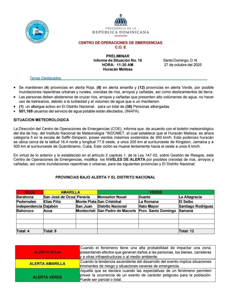 Según el Informe de Situación No. 16 emitido por el COE, se mantienen 4 provincias en alerta roja, 8 en alerta amarilla y 12 en verde, ante posibles inundaciones repentinas, crecidas de ríos y deslizamientos de tierra. Un total de 737 viviendas resultaron afectadas, 18 parcialmente dañadas y 2 destruidas, mientras 3,785 personas fueron evacuadas y 38 permanecen albergadas en el Distrito Nacional.