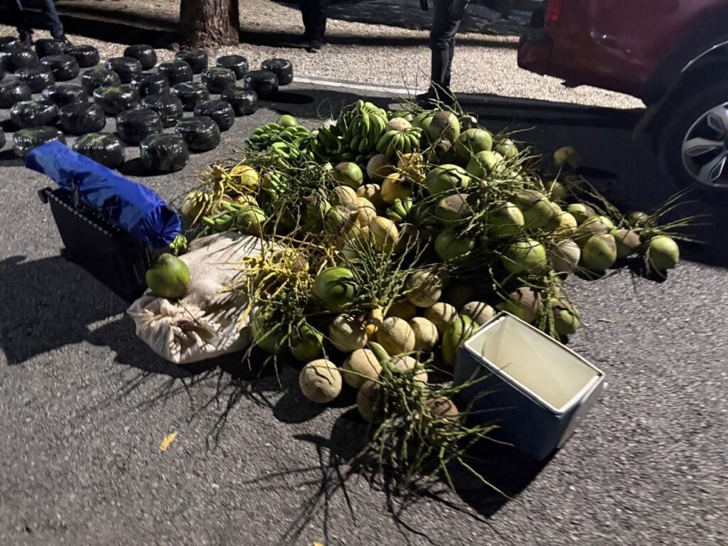 Por instrucciones del fiscal y en presencia del imputado, se realizó una inspección al vehículo ocupando en la parte trasera, camuflados en una carga de cocos, guineos y frutas, un alijo de 40 pacas de marihuana, con un peso de 209.56 libras.
