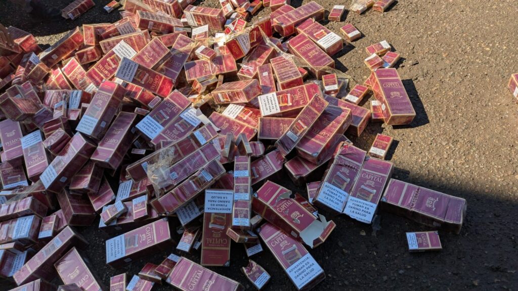 En los vehículos se encontraron 458 paquetes de cigarrillos marca Capital, cada paquete con 10 cajetillas de 20 unidades, para un total de 91,600 unidades.