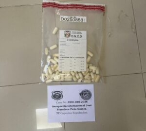 Santo Domingo.- Dentro de su firme y constante misión de combatir el narcotráfico, agentes de la Dirección Nacional de Control de Drogas (DNCD) y miembros del Cuerpo Especializado de Seguridad Aeroportuaria, (CESAC) e inspectores de Aduanas (DGA), apoyados por el Ministerio Público, arrestaron a un ciudadano español, con el estómago lleno de bolsitas presumiblemente cocaína.