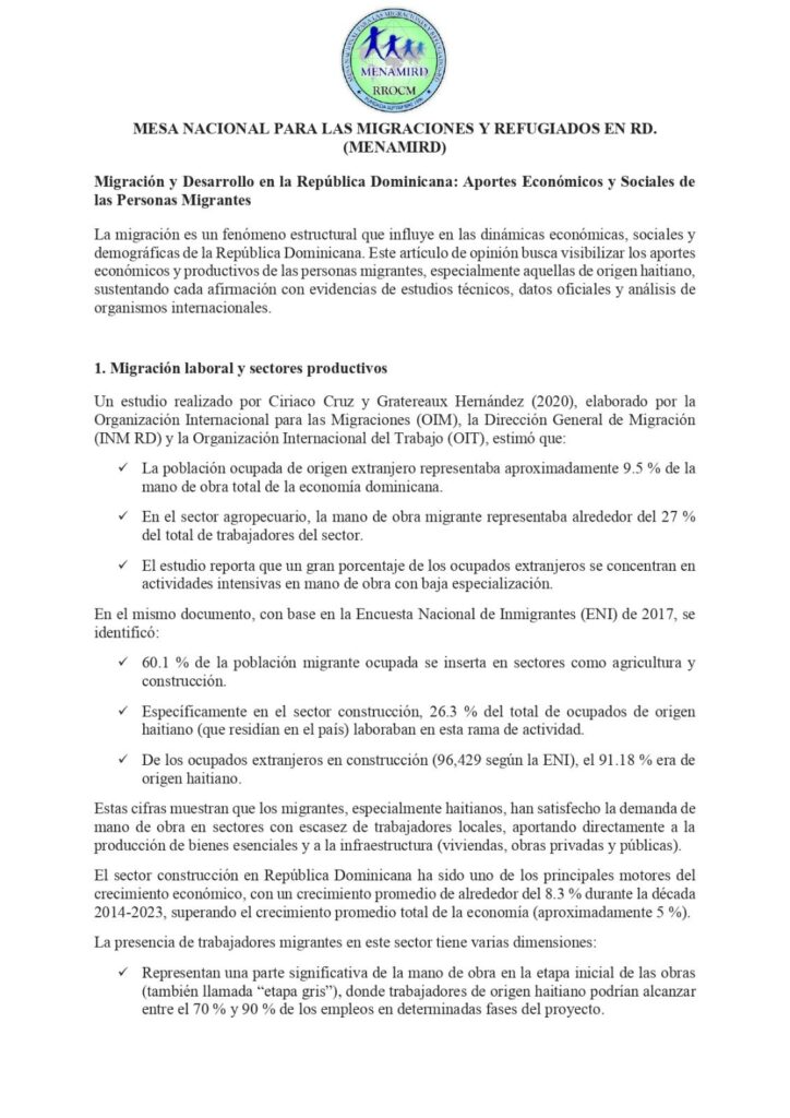 Santo Domingo, RD. La Mesa Nacional para las Migraciones y Refugiados en República Dominicana (MENAMIRD) presentó un informe técnico en el que analiza los aportes económicos, sociales y demográficos de la población migrante en el país, destacando su participación en sectores productivos clave y su impacto en la estabilidad financiera nacional.