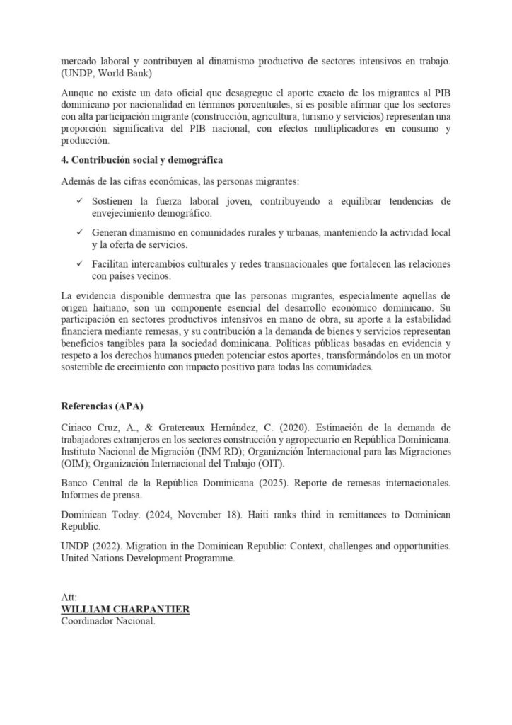 El documento fue dado a conocer por su coordinador general, William Charpantier, quien explicó que el objetivo es “visibilizar con datos verificables el rol que desempeñan las personas migrantes en el desarrollo económico dominicano”.