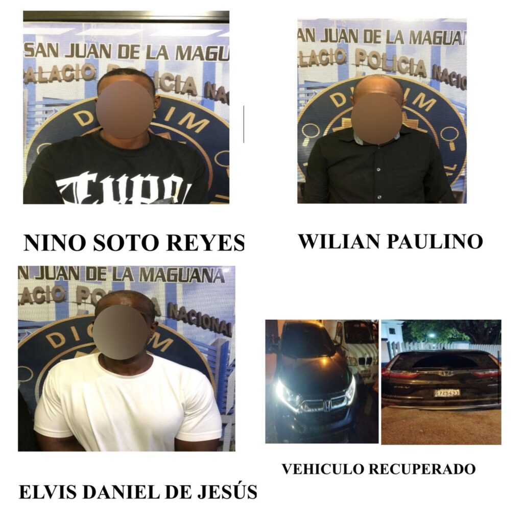 Agentes de la Dirección Central de Investigación (DICRIM), en coordinación con la Policía Preventiva, recuperaron en la provincia San Juan una jeepeta denunciada como robada y arrestaron a tres hombres que fueron sorprendidos en flagrante delito cuando trasladaban el vehículo hacia la frontera con intención de venderlo.